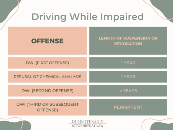 A first-time offender will receive a suspension for a minimum of one year. For a second offense, the minimum suspension is four years, while the maximum penalty is a permanent loss of driving privileges. Should you receive multiple convictions, or have aggravating factors, like a child in the vehicle, the penalties increase.